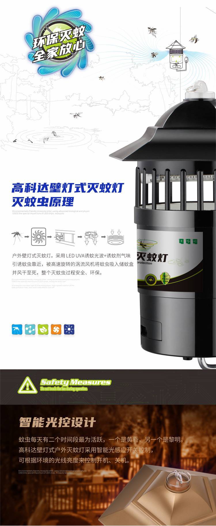 壁灯式户外防水灭蚊灯产品特点:可当草坪灯、庭院灯、壁灯使用(高效、环保、安全灭蚊)。