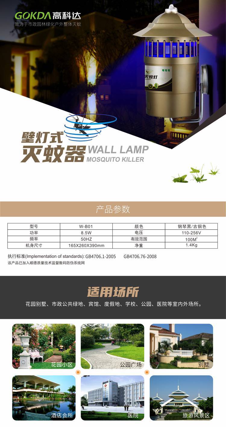 壁灯式防水灭蚊灯适用环境:?花园别墅、市政公共绿地、宾馆、度假地、俱乐部会所、学校、公园、医院等。
