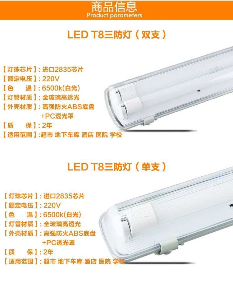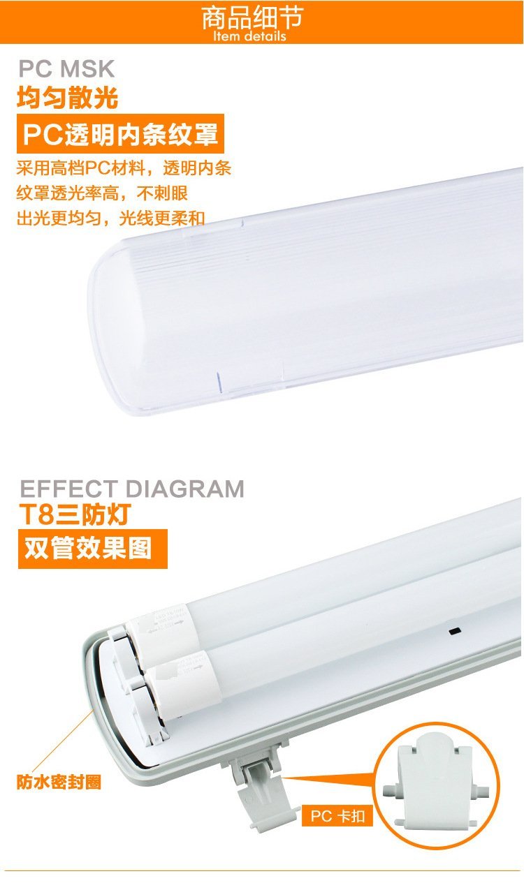 2:T8普通日光灯三防灯具,T8三防灯是一款应用比较广的灯具,是针对普通日光灯来设计的,具有通用性,也是目前为应用较多的日光灯管。