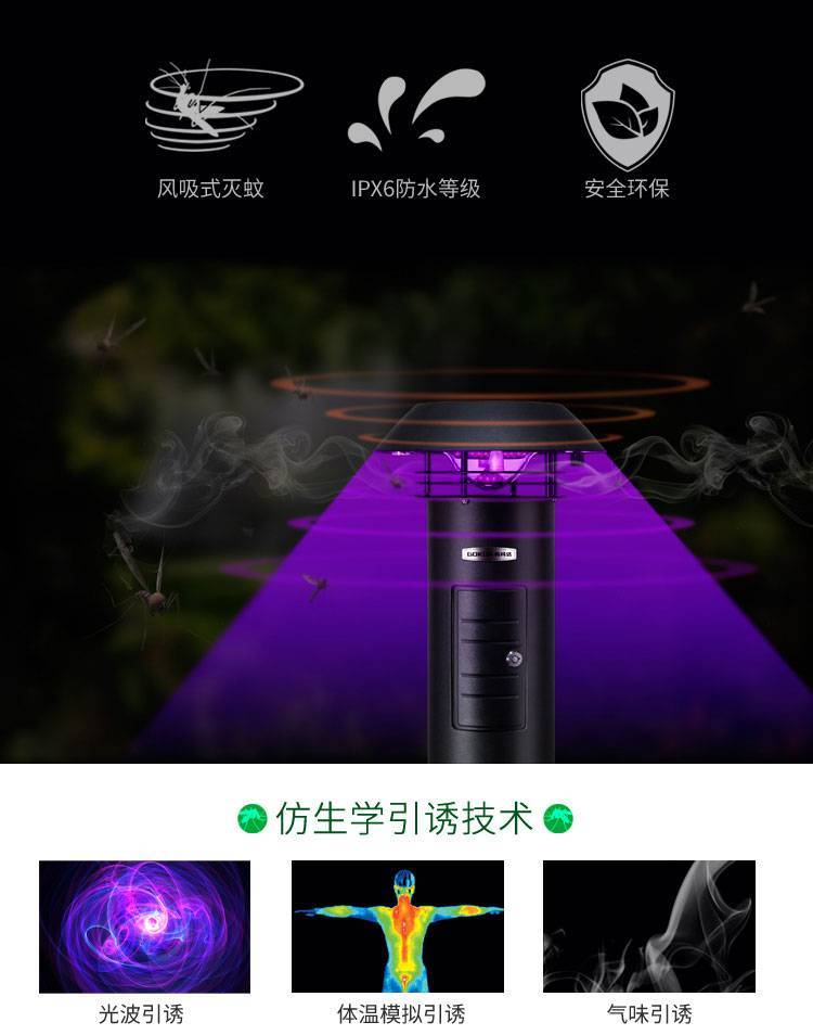 GOKDA高科达草坪灭蚊灯H-X5使用全不锈钢机身,工业设计造型美观,具户外照明、灭蚊、杀菌、环境装饰一体化功能。运用先进的生物诱蚊技术和物理灭蚊设备,采用特制进口LED诱蚊芯片(使用寿命长达3年以上)所散发的365紫外诱蚊光波引诱蚊虫靠近,高速旋转的涡流风机将蚊虫吸入储蚊盒并风干至死,安全无污染,无毒副作用。从而达到绿色除虫、环保灭蚊的目的。