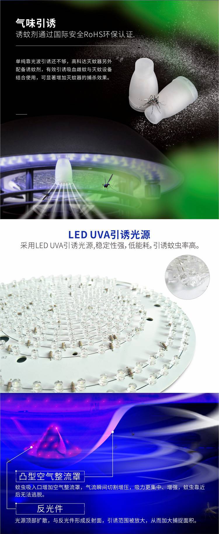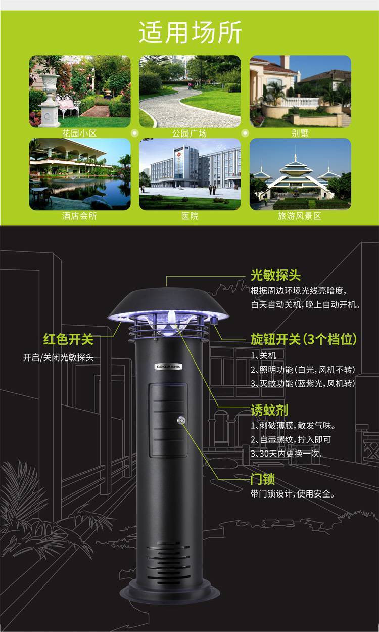 全新草坪灯式灭蚊器使用不锈钢机身,工业设计造型美观,具户外照明、灭蚊、环境装饰一体化功能。运用生物诱蚊技术和物理灭蚊设备,采用光波 气味 热感模拟引诱蚊虫靠近,高速旋转的涡流风机将蚊虫吸入储蚊网兜并风干至死,安全防水。适用于物业小区、别墅花园、学校灭蚊从而达到绿色除虫、环保灭蚊的目的。