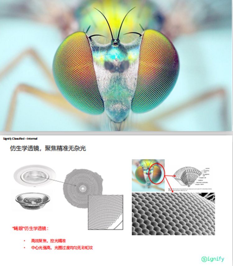2、仿生透镜,控光:仿生学蝇眼透镜,高效聚光,光斑过度自然,无彩虹纹
