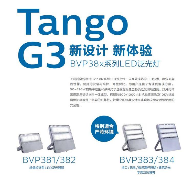 飞利浦全新推出BVP384系列LED投光灯,以高效成熟的LED技术,稳定可靠的性能,便捷的安装于维护,超值的性价比,为用户提供完美的泛光照明解决方案。