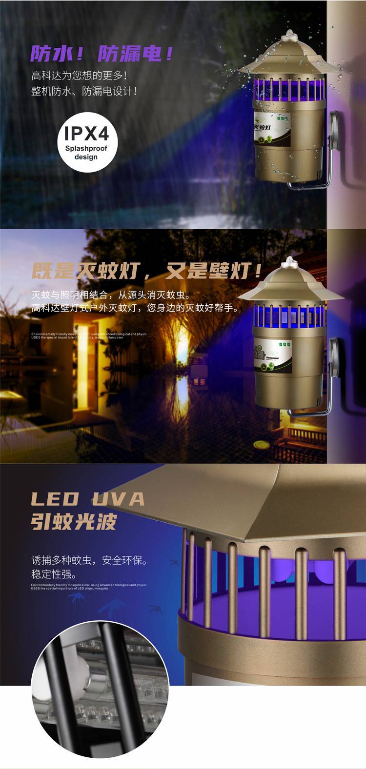 壁灯式户外防水灭蚊灯产品特点:可当草坪灯、庭院灯、壁灯使用(高效、环保、安全灭蚊)。