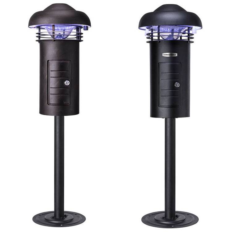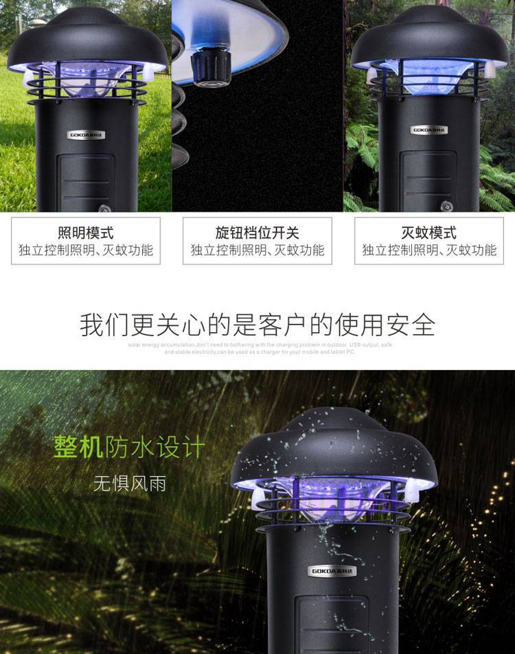 高科达GOKDA草坪灭蚊灯使用全金属机身,工业设计造型美观,具户外照明、灭蚊、环境装饰一体化功能。运用生物诱蚊技术和物理灭蚊设备,采用订制进口LED UV诱蚊芯片所散发的365紫外诱蚊光波 蚊虫信息素气味 体温模拟引诱蚊虫靠近,高速旋转的涡流风机将蚊虫吸入储蚊盒并风干至死,安全无污染。从而达到绿色除虫、环保灭蚊的目的。