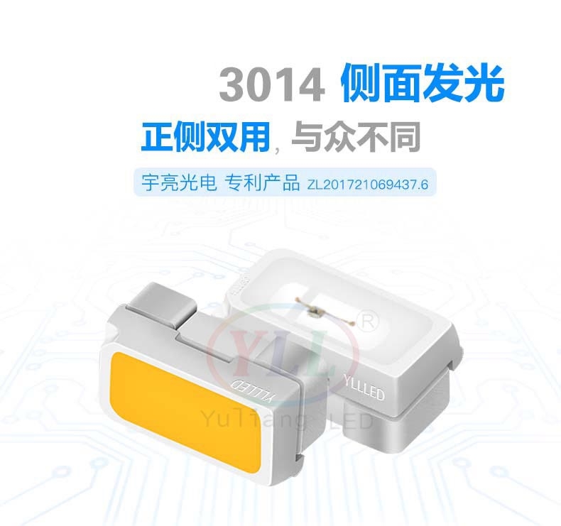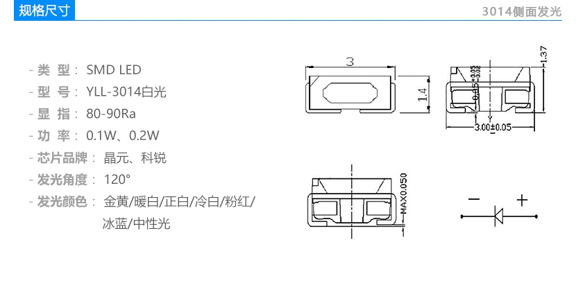 3014侧发光白色光、单色光 LED灯珠特性及参数:中小功率、高亮度、正侧双贴、正发光、侧发光、厚支架、不易被折断、散热好、超低光衰
