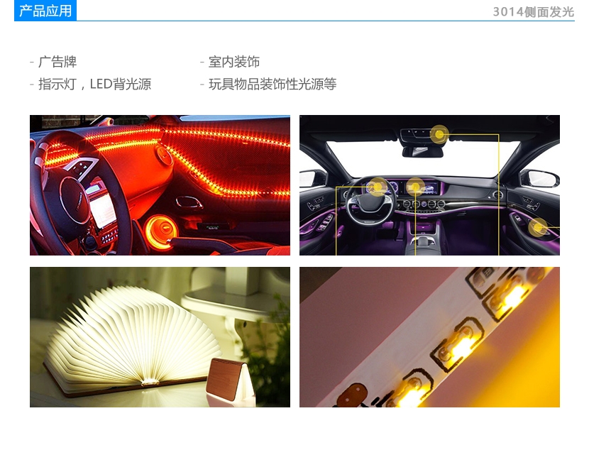 3014侧发光白色光、单色光 LED灯珠应用:广告牌、室内装饰、指示灯、LED背光源、玩具物品装饰性光源等