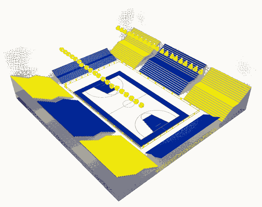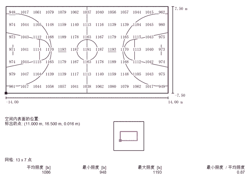 举例:场馆长度50米,宽度48米,带观众席,采用马道安装方式,净空高度15米,照度设计为专业比赛,非电视转播要求,采用FS-QC0869-300W LED球场灯