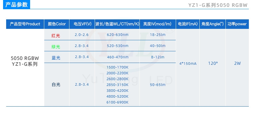“YZ1”系列5050RGBW四合一LED贴片灯珠,2瓦大功率LED