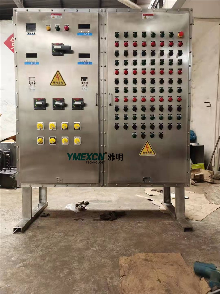 一、防爆配电箱结构特点1、不锈钢焊接成型。2、内装开关、电流表、指示灯、按钮、PLC、变频器、接触器、仪表等。3、安装方式:挂式、落地式。4、钢管或电缆布线。5、外形尺寸根据实际情况而定。