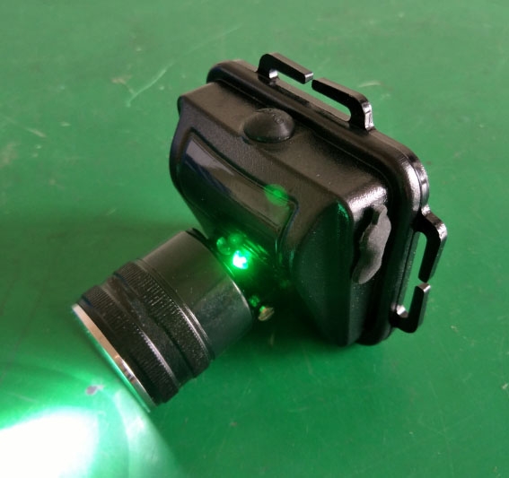 次头灯的开关按钮,工作光点亮;次,转换为强光;第三次,转换为闪烁;第四次,电源关闭。