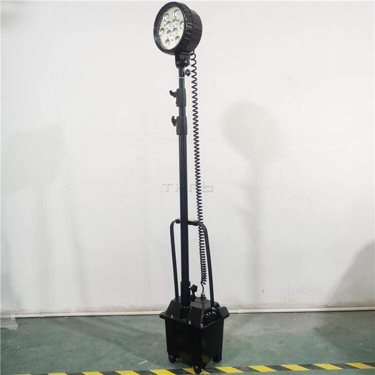 灯头采用全密封一体式设计,可固定在箱体或其它支撑物上使用,也可卸下手持式使用,照明角度可任意调节,一体式升降杆结构,灯头可在1.2米~3米高度范围内任意升降。 分体式三脚固定架,灯头可在1.2米~2.8米高度范围内任意升降。
