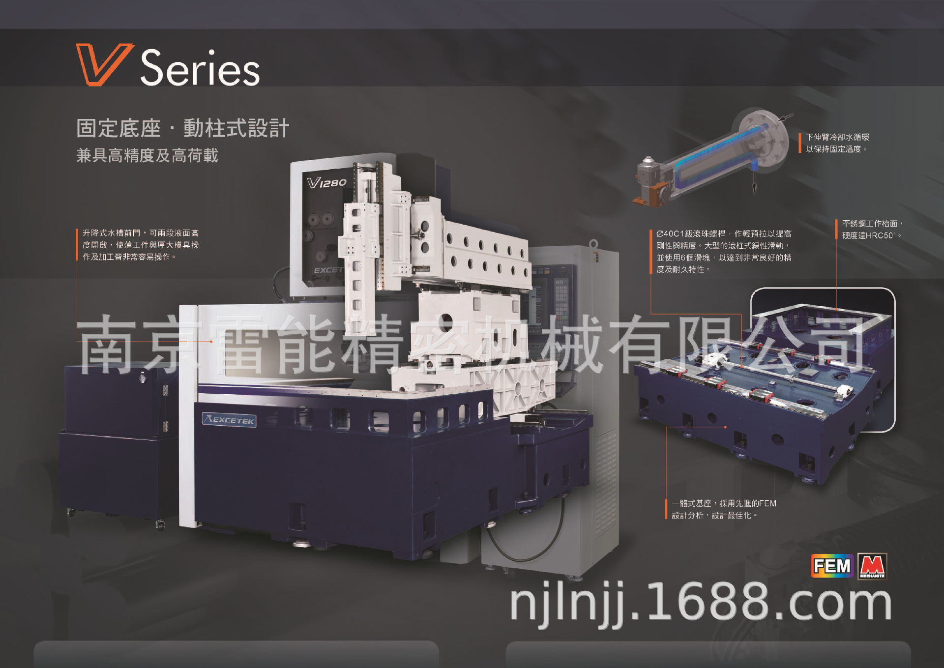 采用日本高精密机械結構设计及底座高刚性铸件设计,采用有限元素分析设计机器本体,配合支柱(RIB)设计来承载立柱,降低铸件应力所造成的变形,以达到高精密的基本要素。