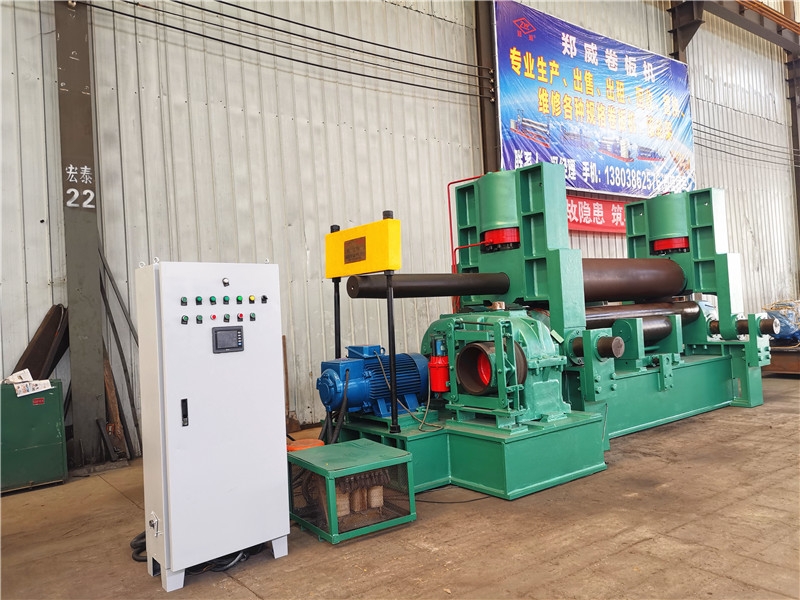 该机属于液压型三辊卷板机,用于常温状态下将各种容器用碳钢、低合金钢一次上料后不需调头即完成板材端部预弯、卷圆和矫圆等工序。 上辊可以垂直移动、水平移动。 预弯通过上辊水平移动,使上辊相对于下辊呈非对称位置来实现。有效地解决剩余直边问题。
