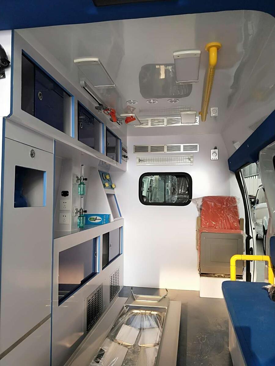 1、便携折叠式担架1件;2、医药柜1件;3、固定安装氧气瓶1只;4、输液吊钩2只;5、消毒灯1只;6、污物桶1只;7、单人座椅3只;8、长条贮藏柜带2人位软座垫、软靠背和安全带1套;9、中隔断带铝合金滑窗1套;10、前顶装全蓝灯警报器1套;11、照明灯2只;12、逆变器1只;13、电源插座1组;14、中门上车扶手;15、后门上车踏板;16、医用耐磨塑胶地板革;17、贴救护十字标志;