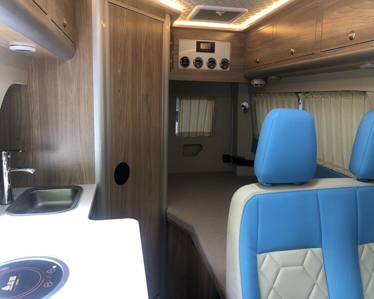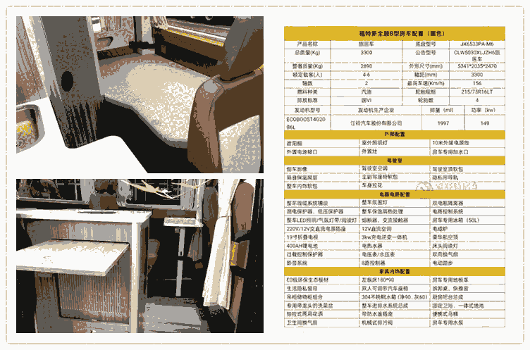 国六福特新全顺小额头T型房车,纯进口发动机,2.0T汽油自动挡,自由穿梭一线城市,低低风阻不惧限高,奢华内装:48v电路、进口KME空调、燃油加热器、高光板材、柚木地板、顶、盒式马桶。