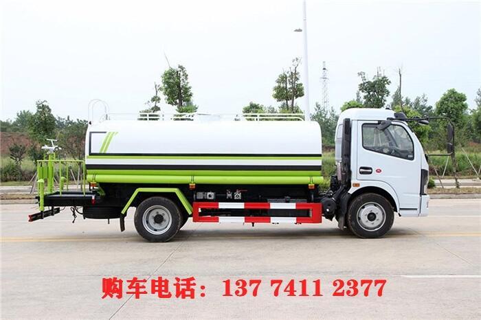 洒水车前冲(喷)后洒,带侧喷,罐体后带工作平台,平台上安装绿化洒水炮,洒水炮可旋转,可连续调成直冲状、大雨、小雨、毛毛雨,带安全护栏,配备全国质量评比名的杭州威龙大功率专用洒水泵,泵可自吸自排,安装过滤网,带消防接口,可通过消防栓进水,带自流阀,随车选装20米绿化卷盘,可喷洒农药,罐体金属漆。