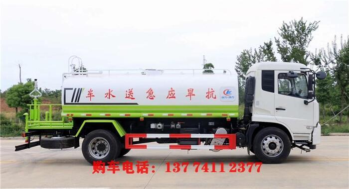 洒水车罐体材质为Q235国标碳钢,厚度为4MM,带大功率专用洒水泵,前冲、侧喷、后洒,带后工作平台和洒水高炮,高位花洒。