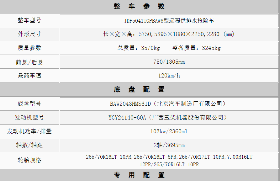 JDF5041TGPBAW6型远程供排水抢险车用于小范围火灾早期扑灭,采用四驱越野底盘,远程供水供水管线车内置照明、远程供水等系统,以取力器为动力源,水带铺设≥3000m,扬程≥500m,射程≥25m;该车的越野性能强,涉水深度为0.6米,垂直越障高度0.35米、越壕宽度0.55米、zui大行驶侧坡40%,可广泛应用于在丘陵、山地、凹地、河谷、森林等地带巡逻,及时发现火情,扑灭小型火灾。