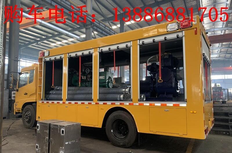 设备采用东风底盘改装,总质量12.5吨,发动机功率127kw,排放标准达到国五标准,3.8米轴距,带空调,方向助力,涉水深度600mm。