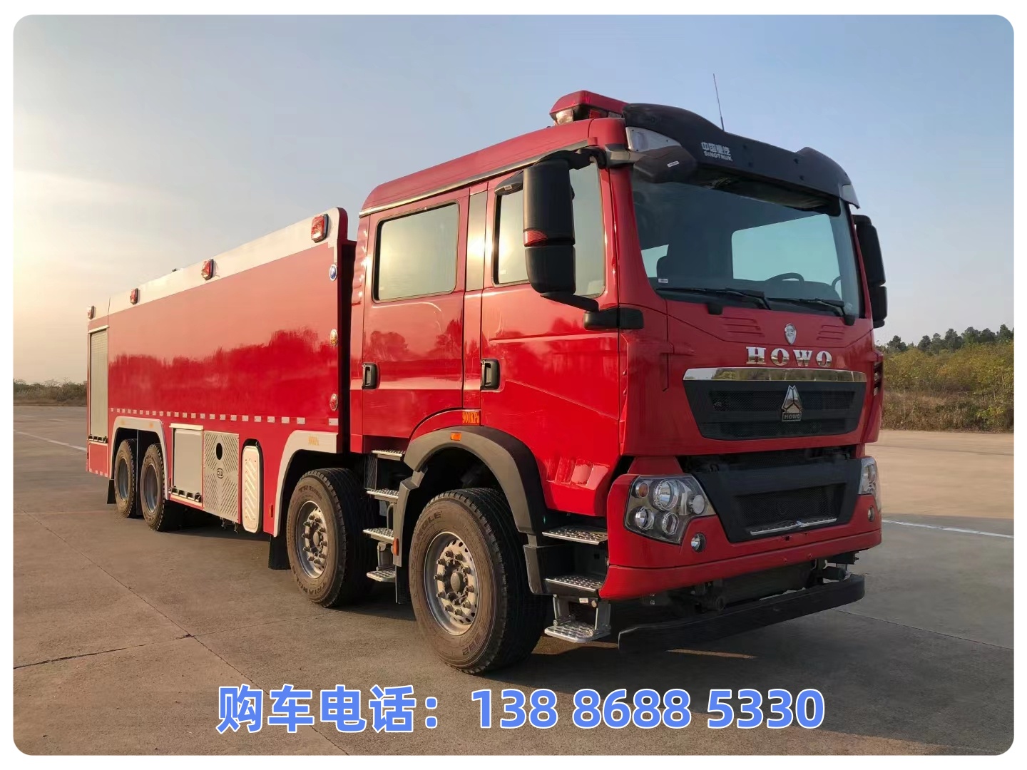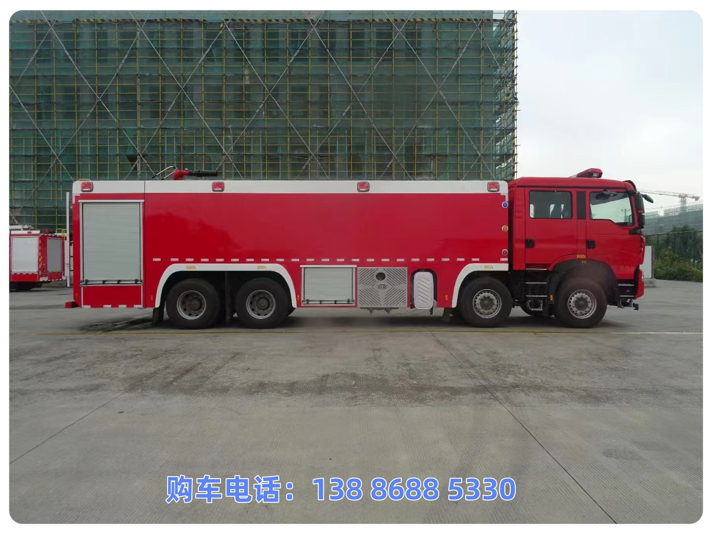 选装右侧安装不同样式的装饰板和选装后部带拉梯架装置。罐体总容积为24.724立方米,水罐容积:20.900立方米,水罐尺寸:5840×2450×1530mm,泡沫液罐容积:3.824立方米,泡沫液罐尺寸:1070×2450×1530mm。整体式侧防护结构,后防护装置材料:Q235A,截面尺寸:120×120mm,与车辆连接方式:螺栓连接,后防护离地高度:465mm, ABS生产企业为威伯科(上海)管理有限公司型号为4460046300。主要专用装置有消防泵、消防炮。