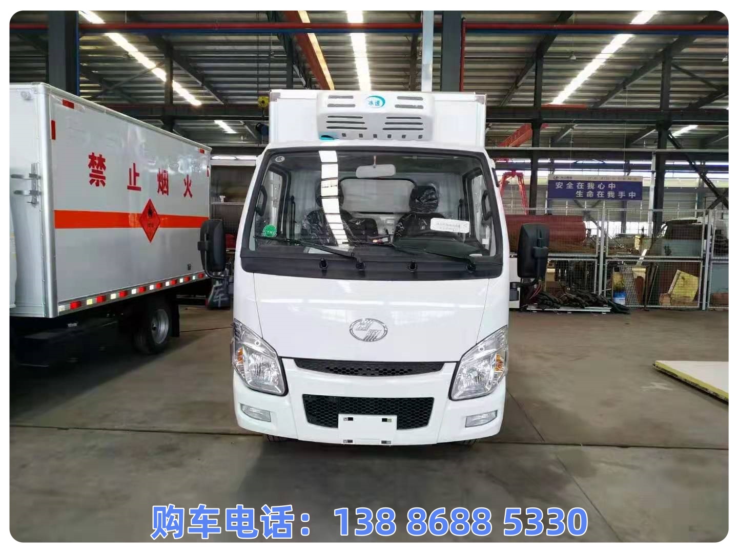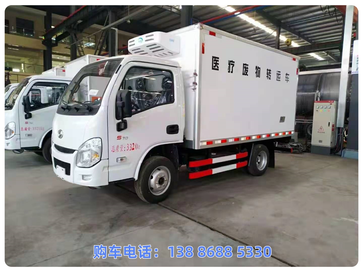 该车厢体顶部封闭,不可开启;选装其它厂家功率相当的制冷机组;运输品名:感染性物质,临床诊断样品B类生物物质,医院诊所废弃物,类项号:6.2,6.2,6.2。整车长/轴距/后悬的关系为(mm):5150/2650/1410,5150/2850/1210;该车前轮安装盘式制动器,前置排气管,装配限速装置,限速80km/h;安装带有卫星定位功能的行驶记录仪;仅采用发动机LJ4A15Q6,对应油耗申报值为10.6L/100km,ABS控制器型号/生产厂家:YF8/武汉元丰汽车电控系统有限公司,随底盘选装驾驶室及轮辋,选装右侧开门,选装ETC车载装置。驾驶室安装双预警装置。整备质量对应的配件配备:润滑济,燃油箱(90%容量)等。