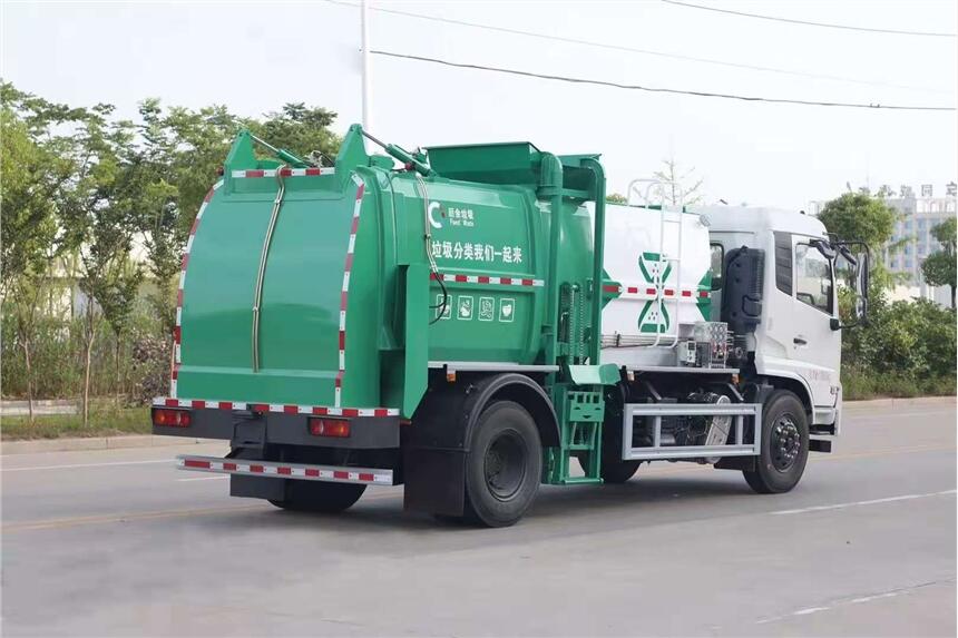 整车外观造型美观大方 垃圾箱横向截面为方型框架、纵向截面为梯形框架,两侧及顶面均为圆弧造型,整机显得美观大方;提升机构将垃圾标准桶提升至车顶以后,再通过翻料机构将桶内的餐厨垃圾倒入车厢内。标准桶再通过提升装置送回地面;推板装置:车厢内设推板装置,可适度压缩和推卸垃圾;装载能力强 且能实现箱内餐厨垃圾油水的初步分离和垃圾减容,并配备有大容量污水箱;垃圾箱与后门总成之间密封性好 垃圾箱与后门总成之间采用特制加强型橡胶条密封,密封性好,杜绝了二次污染;高可靠性与安全性 采用电、液联合控制,并设置了安全保护开关,保证了各机构动作准确、可靠;选装发动机功率输出自动控制 发动机功率输出实现全自动控制,非作业时,发动机怠速状态,作业时,发动机自动加速,满足作业功率的要求.避免了功率损耗和系统发热,耗油降低,经济性好。