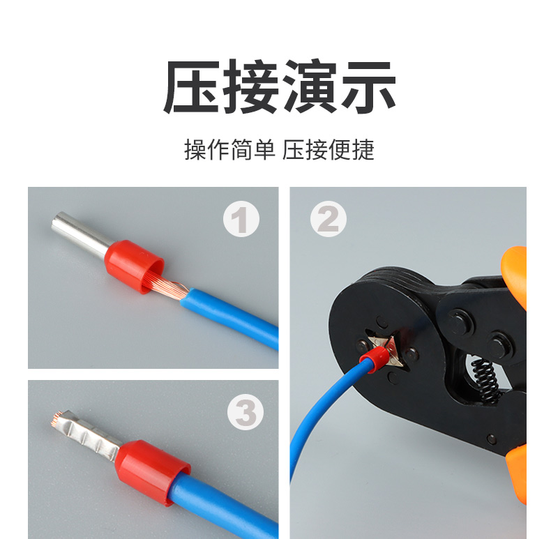 使用方法 | 将电线剥开外皮,穿入端子后铜管,使用端子钳压紧即可 | ||