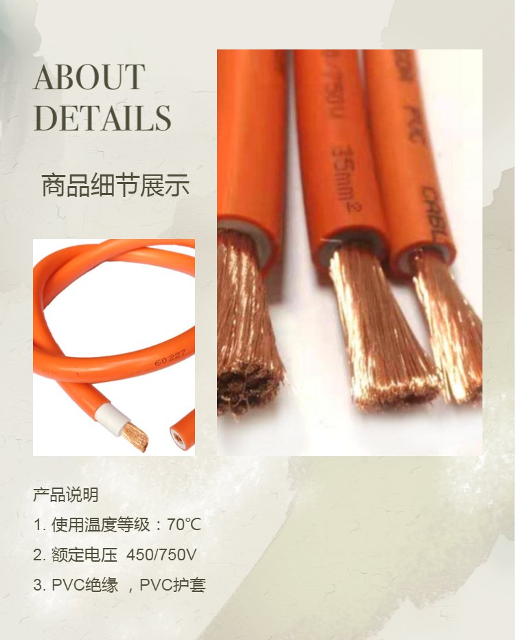 我司为专业电线电缆的生产厂家,电焊线,焊接线,焊把线,火牛电缆线专门用于电镀设备,PCB设备,自动化电镀生产线,电路板设备之上,连接火牛头及整流器上的电缆,此种电缆为双色双层绝缘,内层为白色绝缘的PVC,外被为橙色的PVC,耐高低温、耐腐蚀、耐油性,耐酸碱性极强。 我司规格从16平方—300平方都有现货,质量保证,价格优惠,欢迎订购。