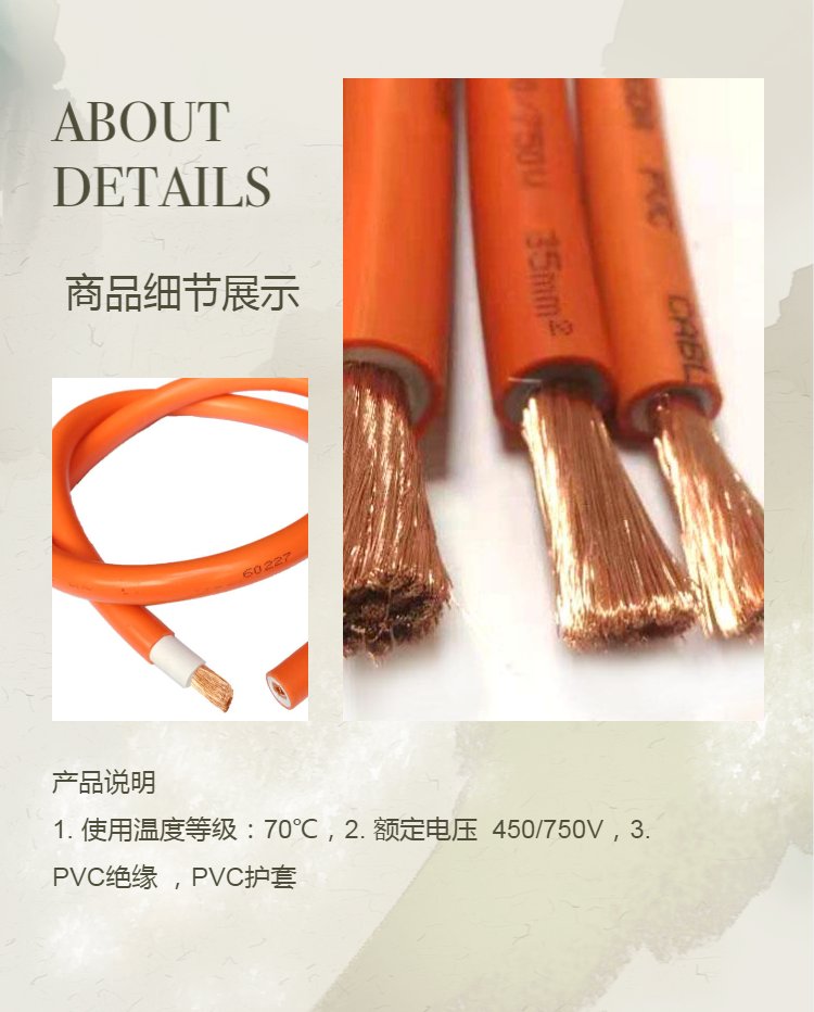 我司为专业电线电缆的生产厂家,电焊线,焊接线,焊把线,火牛电缆线专门用于电镀设备,PCB设备,自动化电镀生产线,电路板设备之上,连接火牛头及整流器上的电缆,此种电缆为双色双层绝缘,内层为白色绝缘的PVC,外被为橙色的PVC,耐高低温、耐腐蚀、耐油性,耐酸碱性极强。