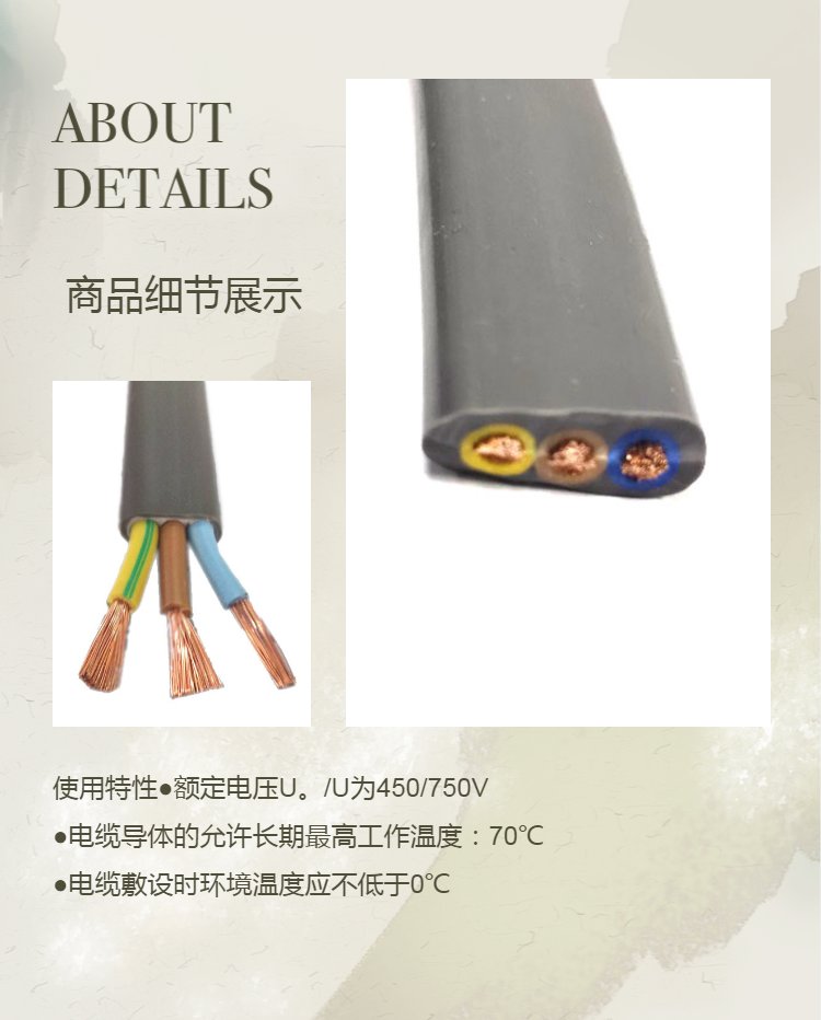 本产品适用的额定电压是450/750V 及以下。正常使用时,导体最高温度为70℃,他适用于-15℃到40℃的环境下使用。