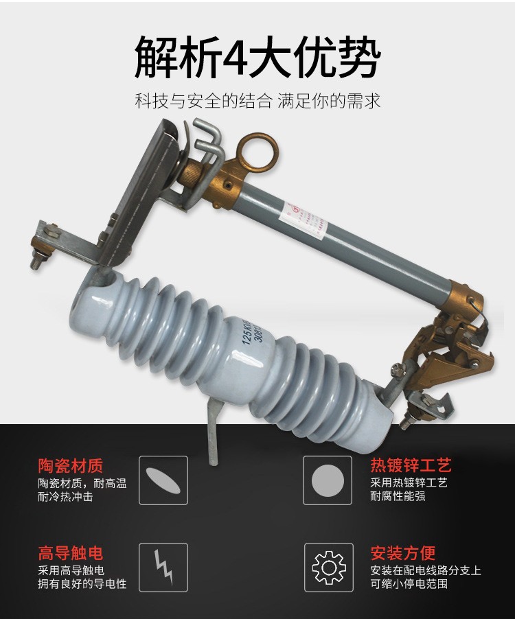 ??户外跌落式熔断器适用于35kv及以下电压频率50Hz电力系统中,作输电线路、电力变压器过载和短路保护,分合额定负荷电流只用,机械寿命≥2000次。