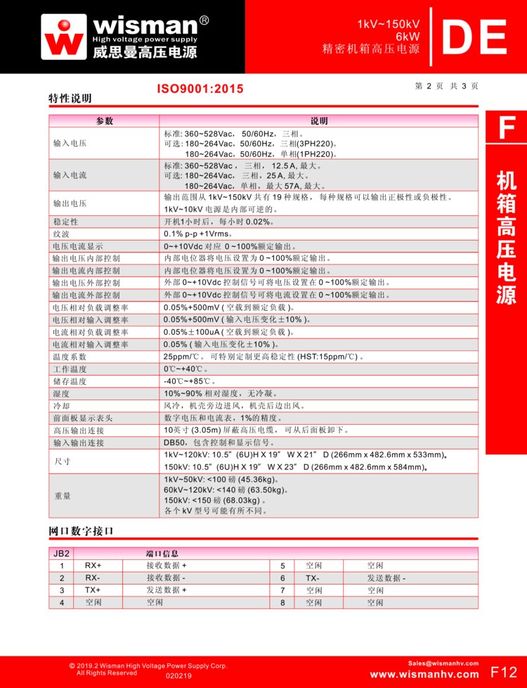威思曼DE系列是高性能19’标准机架式高压电源,DE系列具有完善的保护系统。可遥控或本地控制,前面板有电压和电流显示,高压输出端过压、过流、短路保护、拉弧、过温保护和安全互锁等功能。宽范围调整和灵活的多项可选功能。