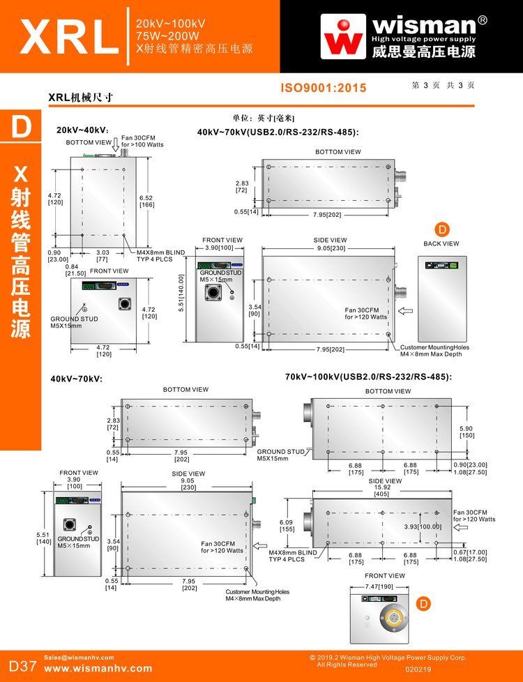 威思曼XRL系列高稳定精密高压电源模块是X光射线管专用小尺寸电源。XRL系列模块电源提供正高压或负高压输出,提供直流对地灯丝电压或悬浮灯丝电压。XRL系列模块电源可以内、外、电脑精密测控,XRL系列模块电源保护有过压、过流、拉弧、安全互锁等。