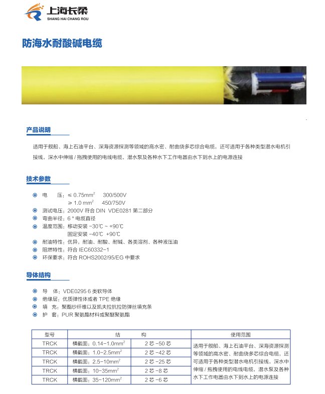 水下设备通信电缆/水密接头电缆 防海水耐腐蚀耐磨抗拉线缆TRCKP 品牌 | 上海长柔 | ||
