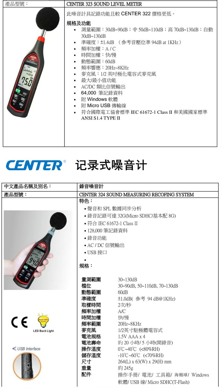 群特CENTER-323/CENTER-324记录式声级计噪音计分贝仪噪声表 品牌 | 台湾群特CENTER | ||