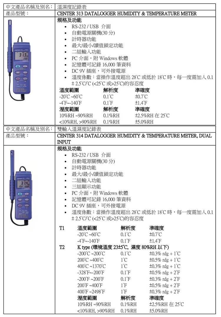 群特CENTER-310/311/313/314温湿度计高精度工业温湿度仪湿度表 品牌 | 台湾群特CENTER | ||