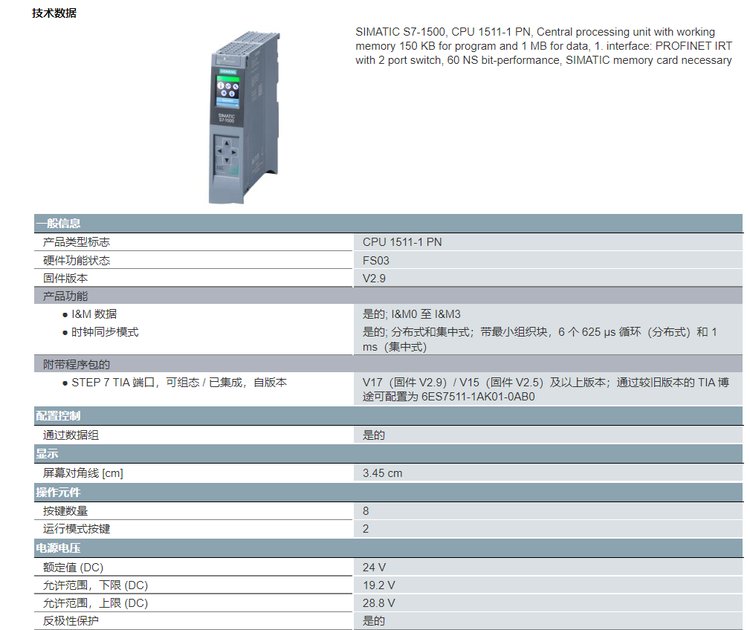 CPU 1511-1 PN,150 KB 程序,1 MB 数据;60 ns;集成 2x PN 接口