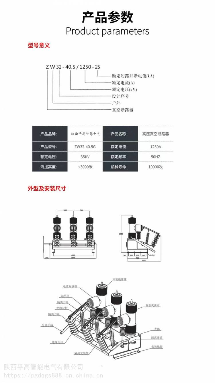 陕西平高智能电气有限公司ZW32-40.5F户外高压真空断路器手动 35KV智能型看门狗柱上开关与配套的智能控制组合。可就地实现开关分合闸操作,也可以通过通信接口由远方操作。断路器的其他信息也可以传输到控制中心,通信通道可以选择电缆、光纤、GPRS/CDMA、GSM等。
