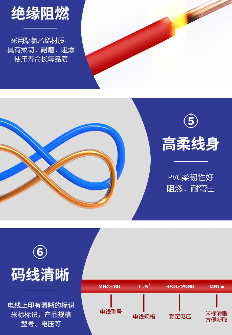 仁达电缆 国标电线 ZRC-BV 450/750V 单芯硬芯线 家用布电线 1*6mm2 是否进口 | 否 | ||