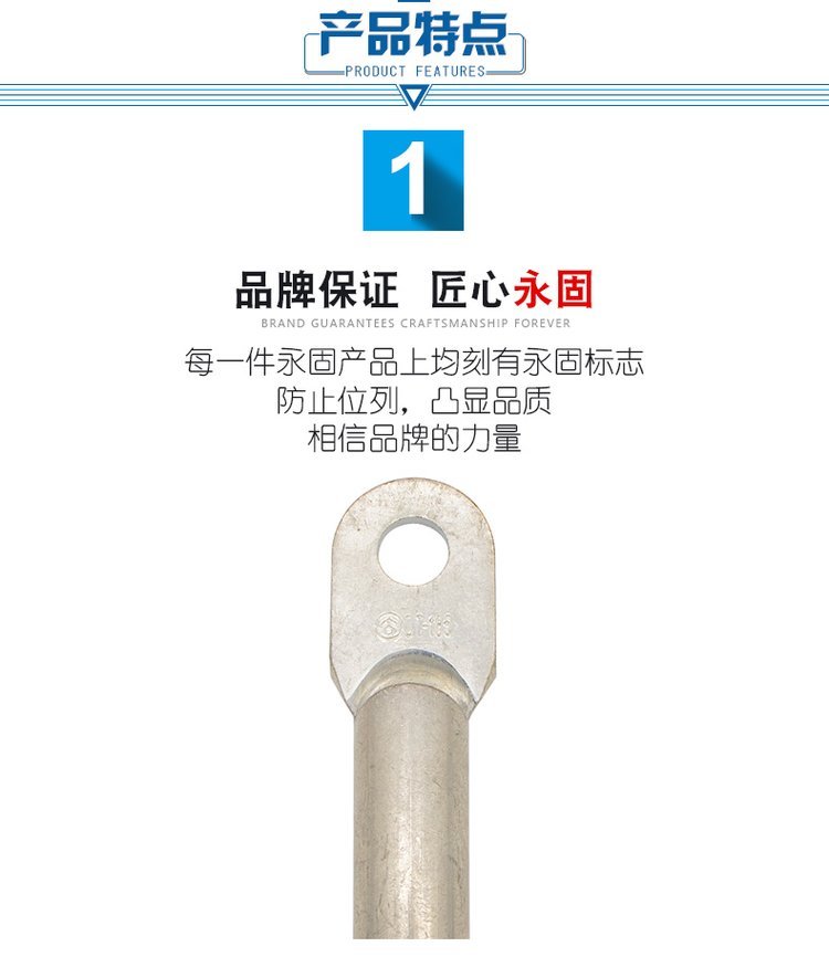 型号1:DT,是由T3铜棒做成, 产品外貌为锅铲圆头,可用于密封堵油,顶端这边为固定上螺丝用,末端插进剥皮后的电缆用端子钳压紧即可。