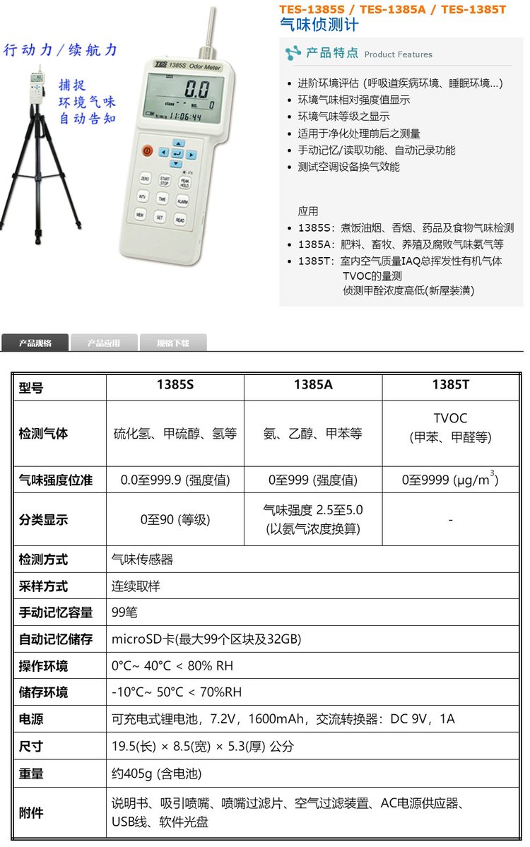 泰仕TES-1385S/1385A/1385T 气味侦测计臭气香气TVOC甲醛苯检测仪 品牌 | 泰仕TES | ||