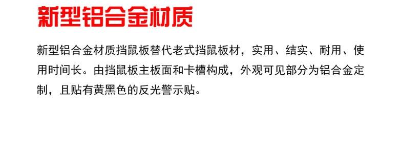 材质: 新型铝合金材质挡鼠板替代老式挡鼠板材,实用、结实、耐用、使用时间长。由挡鼠板主板面和卡槽够成,外观可见部分为铝合金定制,且贴有黄黑色的反光警示贴。