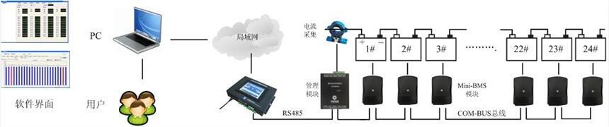 将群菱Mini-BMS模块通过通讯总线串行连接到DCOM-BUS管理模块上,再通过DCOM-BUS管理模块的RS232或RS485与上位机相连,一个DCOM-BUS管理模块最多可接入240个Mini-BMS模块。