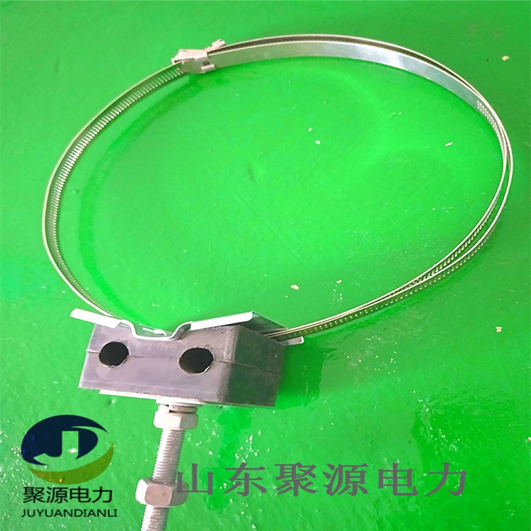 安装方法:1、杆用引下线夹通过304不锈钢带抱箍与电杆连接,将钢带抱箍安装在电杆上, 再将橡胶夹头安装在钢带上,即可完成安装。