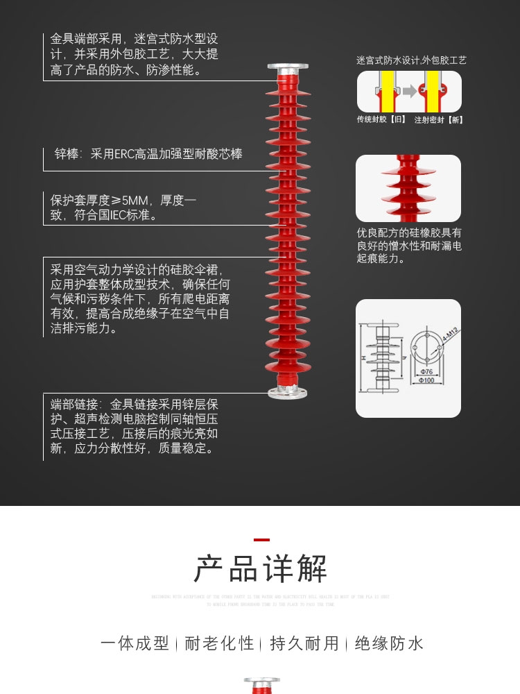 复合支柱绝缘子伞形设计采用大小伞组合的佳优化结构设计,符合相关国家标准要求,能有效保证绝缘子具有优良的外绝缘及电器性能;端部装配件采用压接工艺技术,产品机械性能稳定、可靠且分散性小。