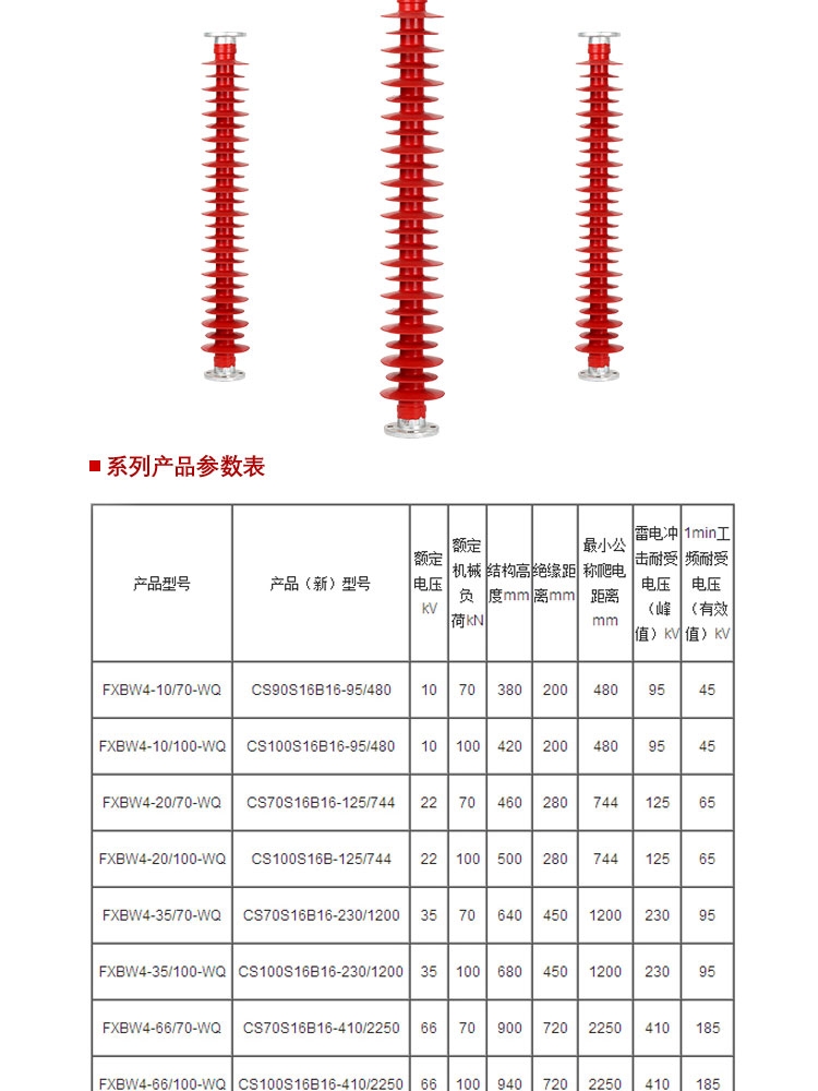 复合支柱绝缘子FZSW-220/10简介:复合绝缘子采用了特种钢材制造的金具,金具端头采用迷宫式设计原理,多层保护,密封性能好,解决了绝缘子最关键的问题----界面电气击穿。金具与芯棒的联接采用国际上最先进的电脑控制同轴恒压压接工艺,并配有全自动声发射探伤检测系统,保证了金具与芯棒的联接的可靠性与稳定性。芯棒采用ERC高温耐酸棒,芯棒与硅橡胶界面涂有特种偶联剂。伞套采用了高温高压下一次性整体成型工艺,配合电脑监控的二段硫化工艺,延长了产品的使用寿命。