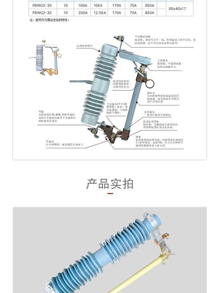 PRWG2-35/100A PRWG2-35/200A PRWG2-40.5/100A  PRWG2-40.5/200A跌落式熔断器概述跌落式熔断器是高压熔断器中安装在10kV配电线路分支线和配电变压器常用的一种短路保护开关。当跌落式熔断器安装在10kV配电线路分支线上时,可缩小停电范围,因其有一个明显的断开点,具备了隔离开关的功能,给检修段线路和设备创造了一个安全作业环境,增加了检修人员的安装在配电变压器上时,可以作为配电变压器的主保护,所以,在10kV配电线路和配电变压器中得到了普及。