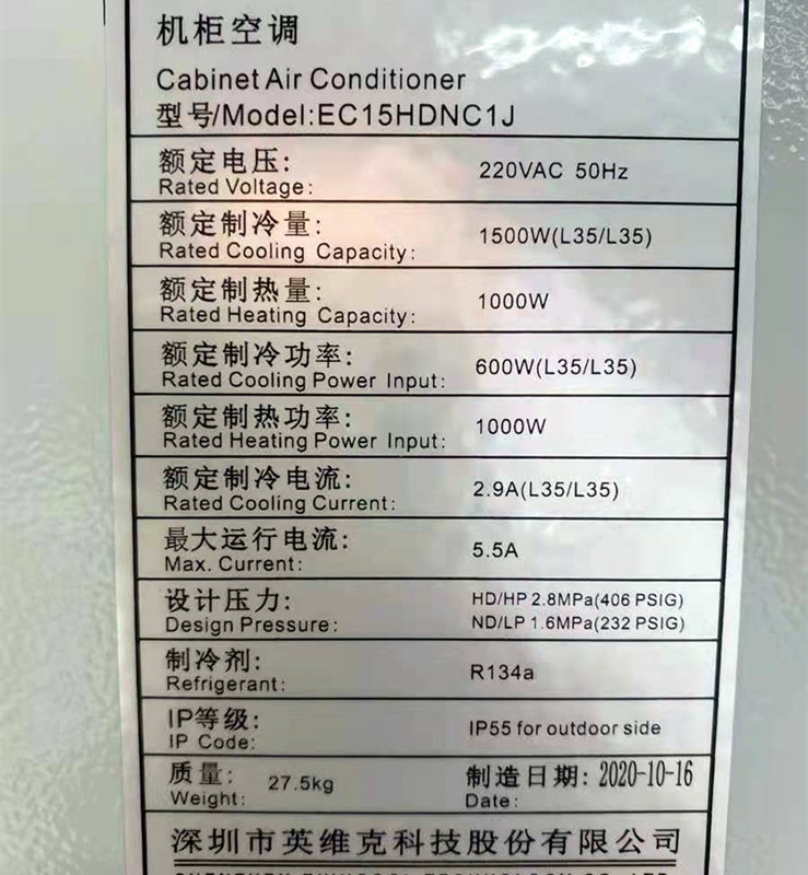 英维克机柜空调EC15HDNC1J 室外通信一体化机柜1500W交流空调全新