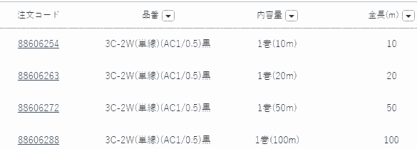 用途屋内引込み線、屋内配線、監視や防犯カメラ等、信号回路や高周波機器間の接続に使用。 ケーブル3C-2W 耐電圧1000V/分 材質(シース)PVC(塩化ビニル) 材質(絶縁体)PE(ポリエチレン) 静電容量67Nf/km 概算質量(kg/km)74 導体抵抗(Ω/km)(20℃)91.4 絶縁抵抗(MΩ/km)1000 シース色黒 導体構成(本/mm)1/0.5 導体外径(Φmm)外部1/3.8、外部2/4.5 絶縁体外径(mm)3.1 シース外径(Φmm)6.5 標準減衰量(dB/km)42(10MHz時) 特性インピーダンス(Ω)75